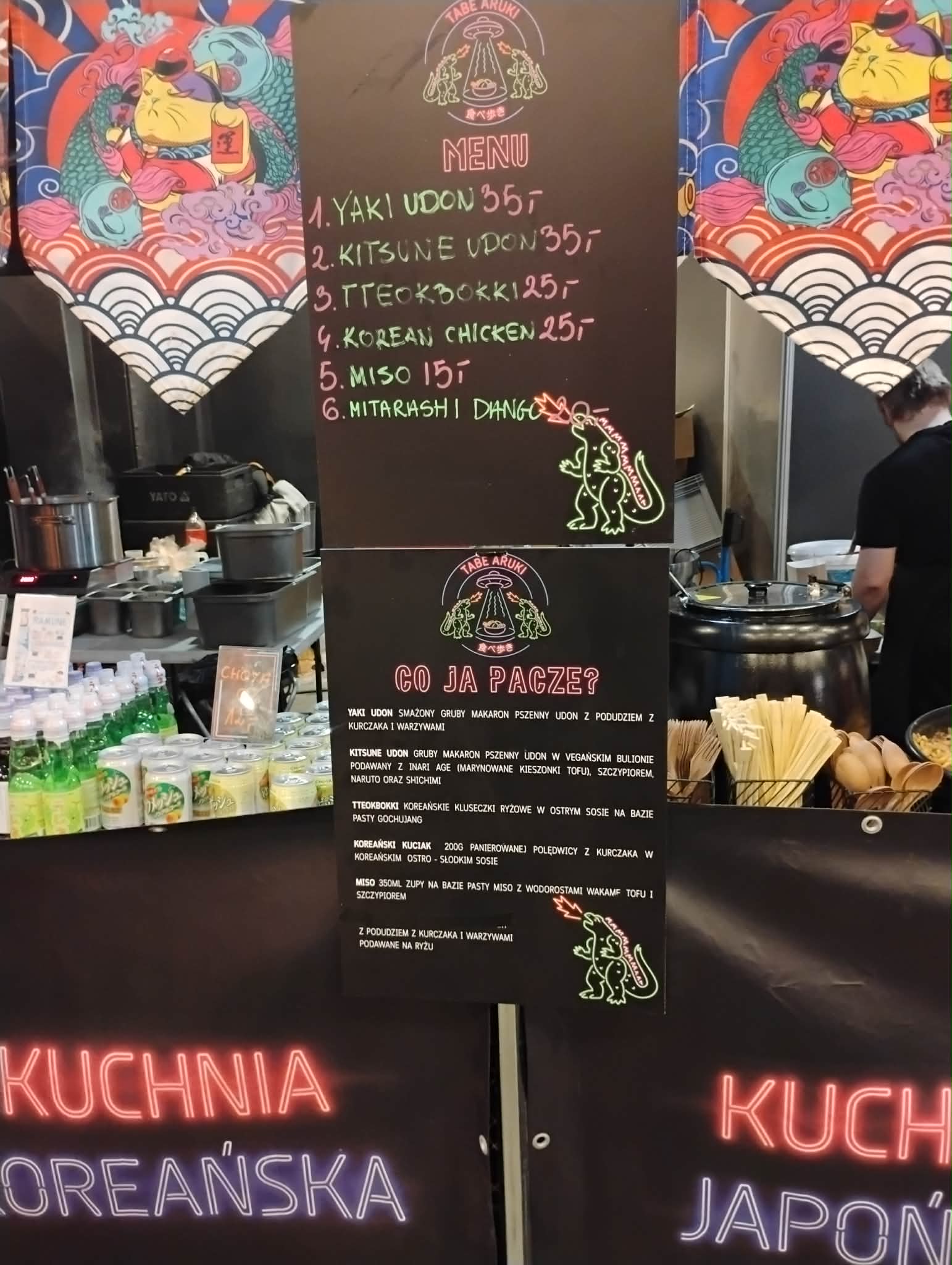 A skoro zajrzeliśmy już na strefę gastro, to przy niej zostańmy, by nie powracać bez potrzeby. Później, na kolację, zjadłem jeszcze corn doga w nachosach – gotowy od ręki, czas czekania właściwie zerowy. W ofercie były także zapiekanki, japońskie pierogi i bodajże rodzaj sajgonek (?), bubble tea, czy owoce w czekoladzie. Ceny festiwalowe, znaczy za kitsune udon 35, a corn dog z nachosami po 38. Oba wyglądały niepozornie, ale wraz ze śniadaniem starczyły na cały dzień, więc jak na dzisiejsze realia jest to "not great, not terrible". Co równie ważne, taka organizacja strefy gastro pozwalała się najeść by możliwie najmniejszym ubytku czasu imprezy.