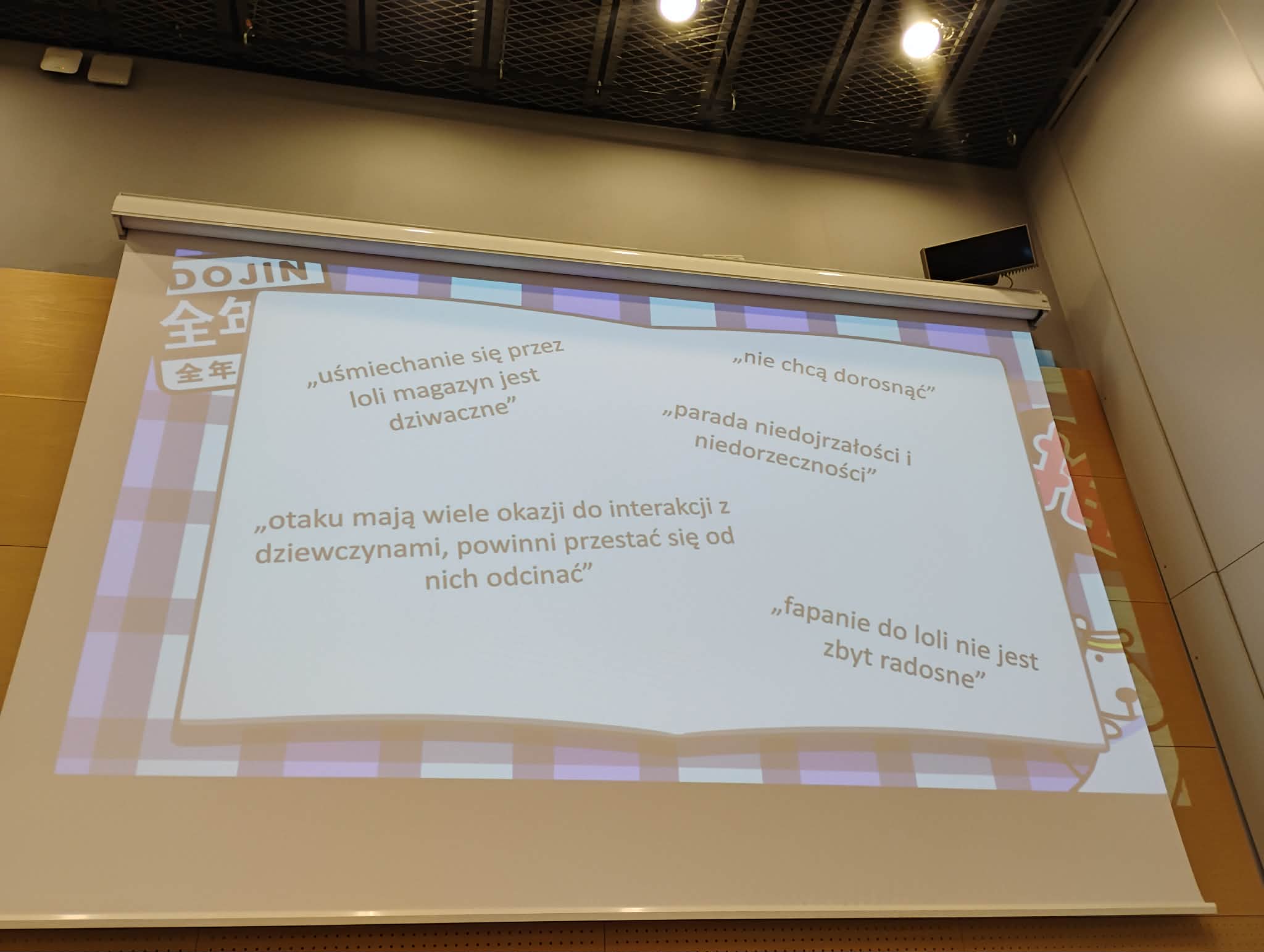 Po wejściu na konwent od razu pognałem na prelkę Shippo o przykuwającym uwagę tytule: "Ostateczny dowód na to, czy fani anime to przegrywy". Nie mogłem tego ominąć, a co ważniejszej, nie rozczarowałem się wyborem! Kawał dobrej roboty, wiele wyjaśniającej z dziejów fandomu i tematyki zakresu mangi oraz anime. Niektóre "zwroty akcji" dziejów były naprawdę zaskakujące. Czy wiedzieliście, że niektóre konwencje tworzenia anime-dziewczyn powstały, aby wygnać z fandomu yaoistki? Sama opowieść była prowadzona żywo, swobodnie i z ewidentną znajomością rzeczy. Mam nadzieję że autorka będzie dalej tworzyć i prezentować na konwencie w następnych latach.
