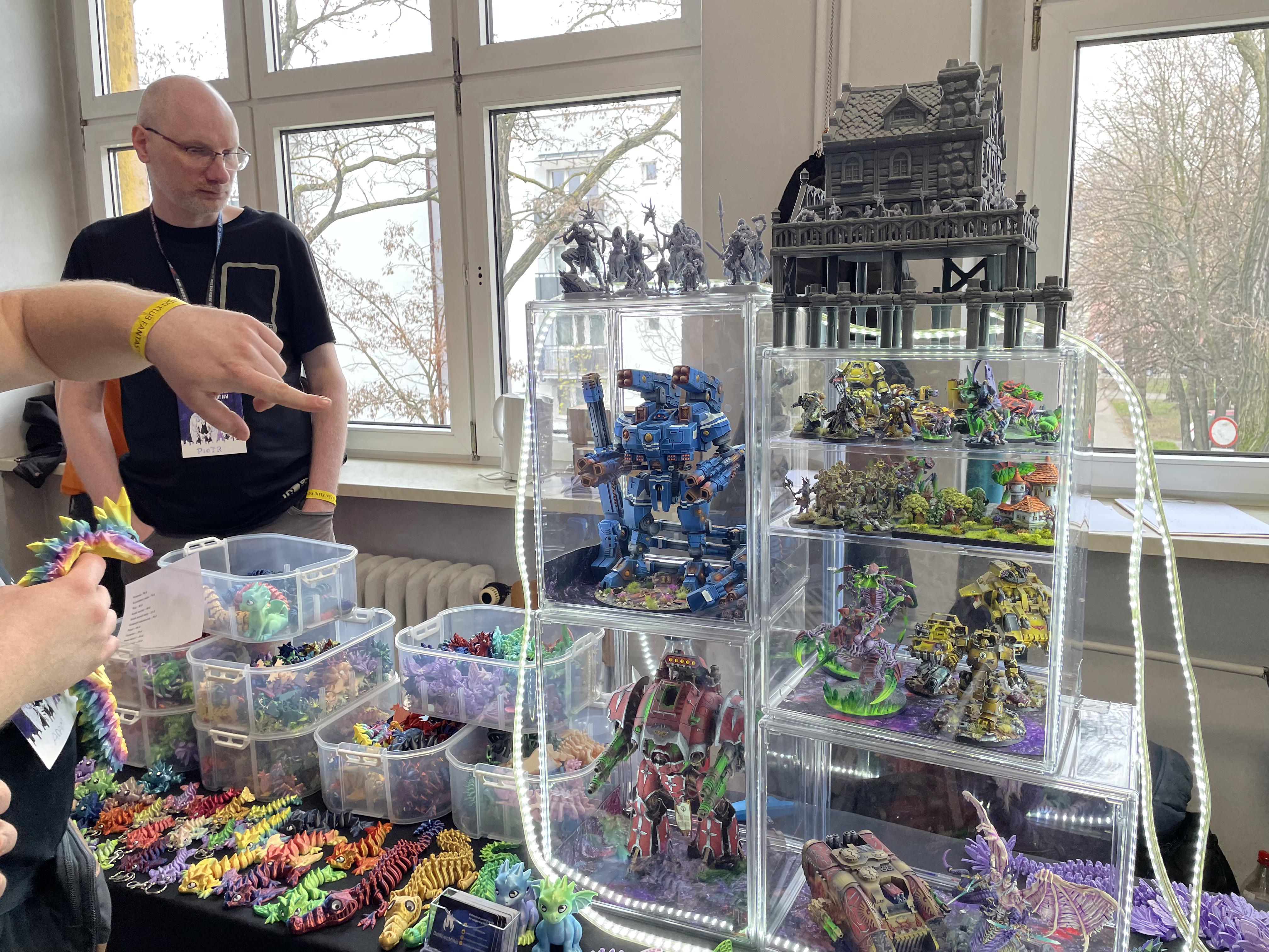 W kwestii stoisk zakupowych nie mam szczególnych uwag. Podobnie jak rok temu, nie było jakiejś koncentracji w jednej dużej sali, sprzedawcy byli rozmieszczeni po korytarzach, tak więc można było się rozejrzeć za pożądanym towarem podczas chodzenia między prelekcjami. Selekcja całkiem spora, a niektórzy mieli dodatkowe atrakcje. Choć pojedynek na krótki fragment opowiadania z AI wydaje mi się trochę dziwny, to ludzie się go podejmowali. Znaleźli się też autorzy komiksów, którzy proponowali dorysowanie dodatkowej grafiki przy sprzedaży swoich dzieł. Poza tym manga, stoiska z książkami czy elementami cosplayu i twórczością własną. Znalazła się nawet wystawa obrazów, do których wykorzystano farby fluorescencyjne (choć na ograniczenie przy nich oświetlenia zdecydowano się dość późno). Moją uwagę przykuło jedno stoisko, na którym były sprzedawane figurki do bitewniaków. Asortyment naprawdę budził podziw, była też opcja kupna już pomalowanych i jestem skłonny się zgodzić, że poziom rzemiosła był adekwatny do ceny (dla przykładu, pomalowana figurka demonicznego Fulgrima była czterokrotnie tańsza od wersji surowej).